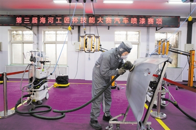 在天津市公用技师学院的汽车喷漆赛场上,16名技能精英在色觉测试、车门损伤修复及喷涂和车辆遮蔽三个模块展开激烈角逐。辨别色差、微调颜色、喷涂色漆……公用技师学院汽车维修专业2020级谢星富专心致志地操作着每一个步骤,因为每一个细节都可能影响全局。他告诉记者,为了参加这次比赛,自己利用一个暑期进行实训准备,力争赛出最佳状态和水平。