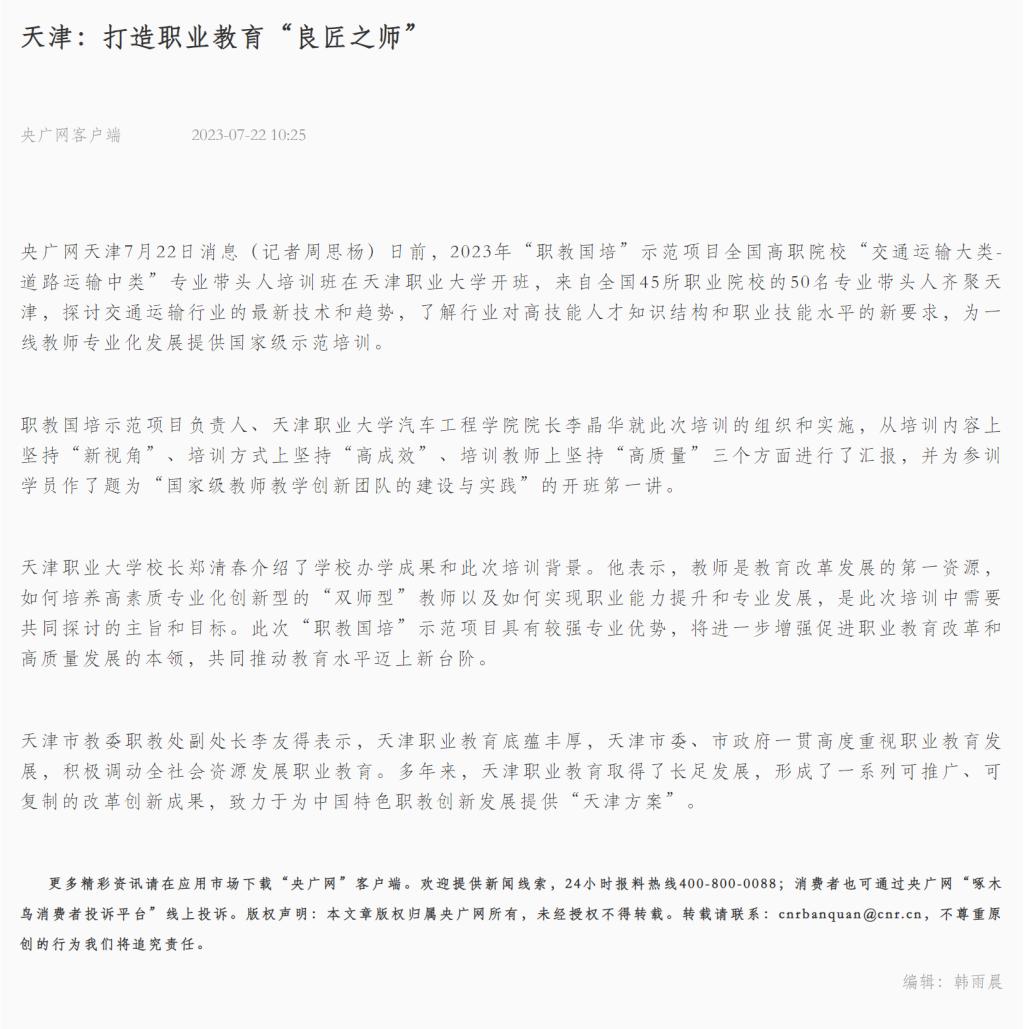 央广网天津7月22日消息(记者周思杨)日前,2023年“职教国培”示范项目全国高职院校“交通运输大类-道路运输中类”专业带头人培训班在天津职业大学开班,来自全国45所职业院校的50名专业带头人齐聚天津,探讨交通运输行业的最新技术和趋势,了解行业对高技能人才知识结构和职业技能水平的新要求,为一线教师专业化发展提供国家级示范培训。