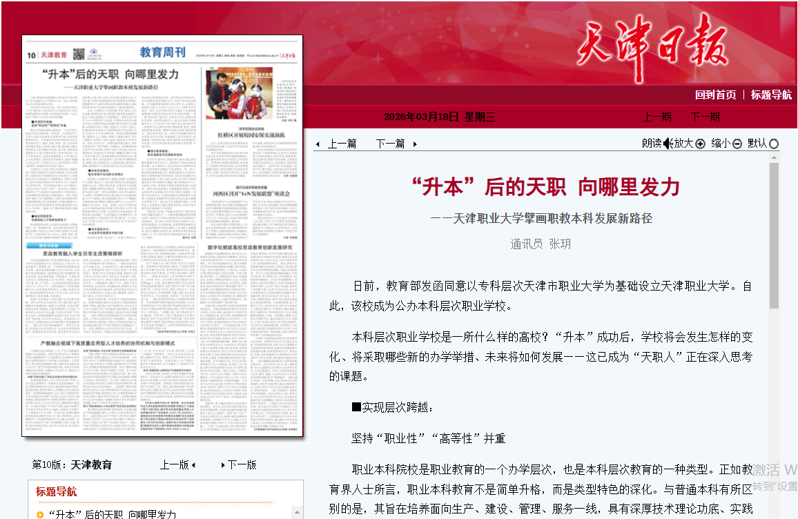 “塑造多元办学、产教融合新形态”“提升职业学校关键办学能力”……《教育强国建设规划纲要(2024—2035年)》为职业教育的未来发展提供了具体路径。成为职业本科学校的天津职业大学,将肩负新使命、开启新征程,全面贯彻党的教育方针,全面把握教育的政治属性、人民属性、战略属性,落实立德树人根本任务,培养更多更优秀的高技能人才,为中国式现代化建设提供更为有力的人才保障。 通讯员 张玥