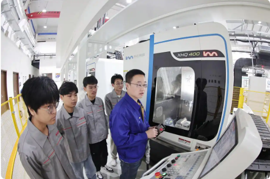 在学校与山东豪迈机械制造有限公司合作共建的豪迈制造天职工厂中,记者看到,高精度五轴加工机床等设备和空压机等配套设备一应俱全。“这个校中厂主要加工汽车轮胎典型模具,通过真实生产开展实习实训,可以实现轮胎模具产品的小试、中试生产。”郑伟介绍,学生在这里参加实训,与在企业场景里一般无二,实现了足不出校即在企业真题真做。