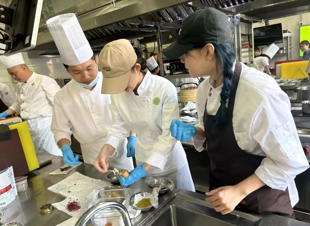 参赛现场各代表队制作出道道美食,并向校企双方领导组成的评委团介绍菜品设计理念,营养搭配以及反映主题,展现对烹饪艺术的深刻理解和创造力。成熟经验与新生代灵感碰撞,满载创意的“未来菜单”,让比赛异彩纷呈,促进新一代美食工匠在比赛历练中积蓄实战经验稳步成长。